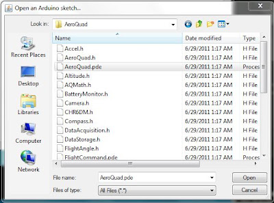 I needed to open the AeroQuad code to start with, so in the Arduino program, I went to File>Open>...>AeroQuad>AeroQuad.pde:This is extremely simple. Just uncomment whatever you're using (take away the "//"), so I uncommented "#define AeroQuad_v18" since I'm using an Arduino with the AeroQuad 1.9 shield (which is essentially the same as the 1.8).